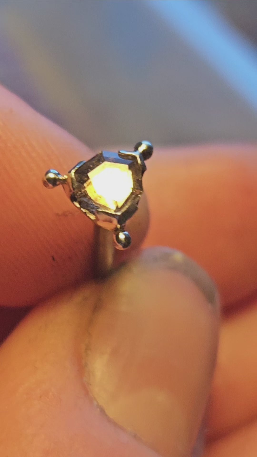 This pice is sold as impfect and reduced due to the chip off the corner of the sapphire. I have uploaded a video trying to show this as best as I can.